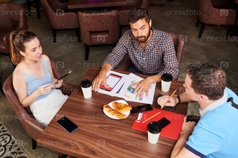 Бизнесмены обсуждают проект в кафе