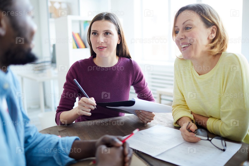 Группа оптимистичных современных коллег в повседневной одежде, сидящих за столом и работающих с данными во время мозгового штурма по идеям проектов