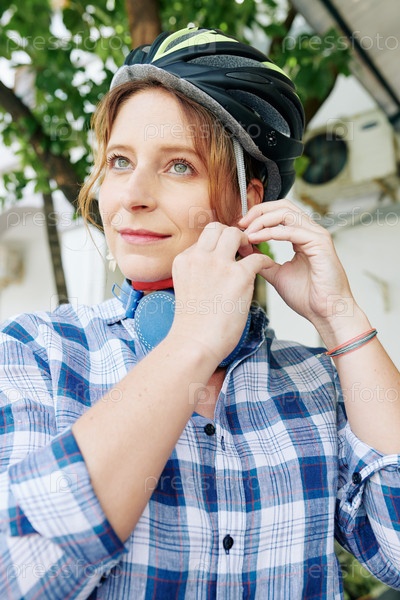 Женщина надевает велосипедный шлем