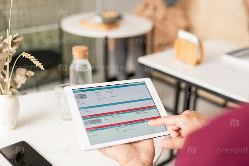 Молодой человек прокручивает электронный документ, сидя за столом