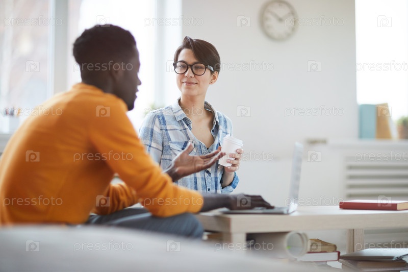 Молодые бизнесмены беседуют на кофейном перерыве