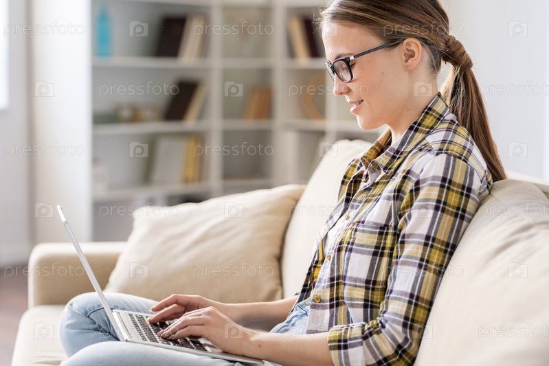 Позитивная молодая женщина, использующая Интернет на ноутбуке