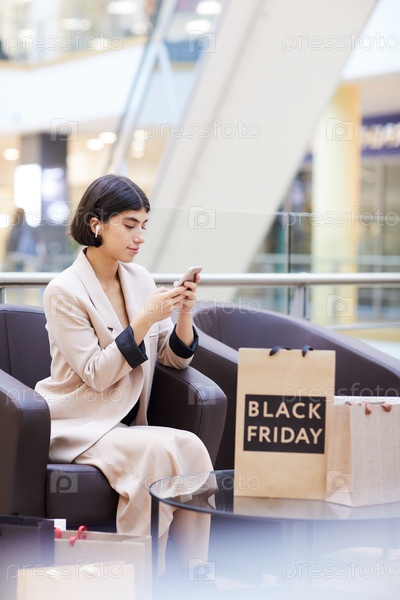 Женщина, использующая смартфон во время отдыха в торговом центре