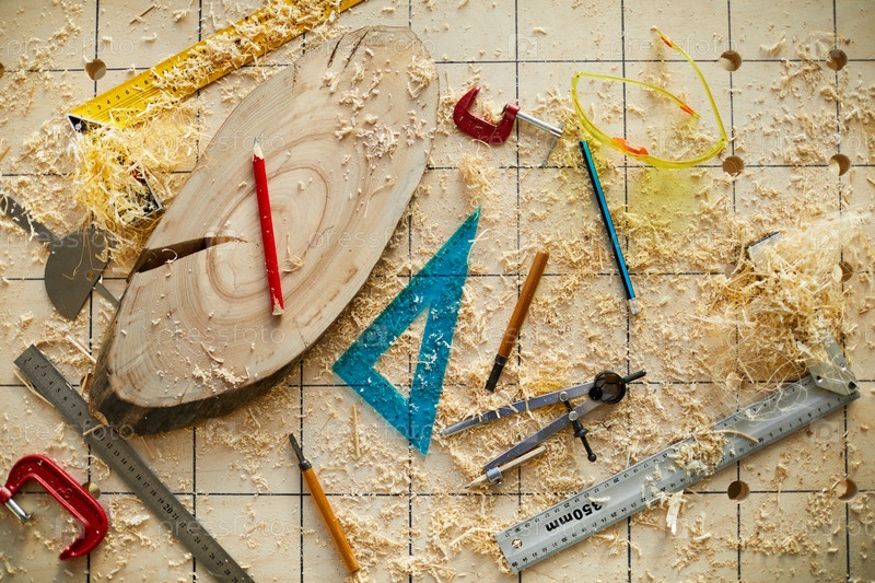 Беспорядок на столе плотницы: верхний вид деревянного стола с измерительными инструментами и куском бревна в пиломатериале