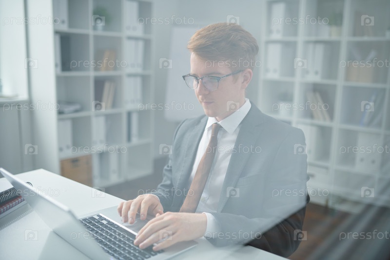Молодой уверенный трейдер в костюме просматривает онлайн-данные