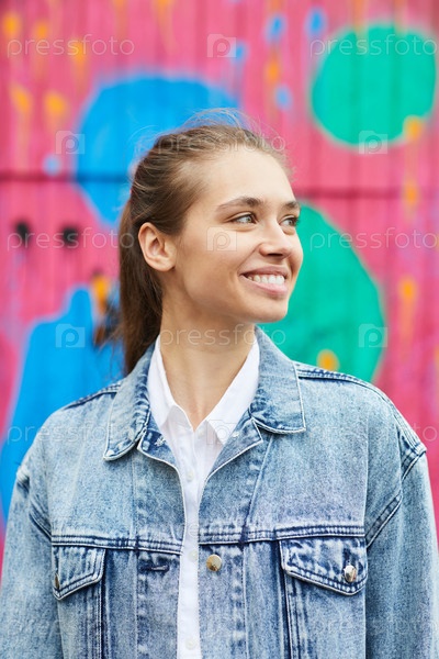 Улыбающаяся целеустремленная красивая девушка в джинсовой куртке и белой рубашке стоит на стене с красочными граффити и смотрит в сторону