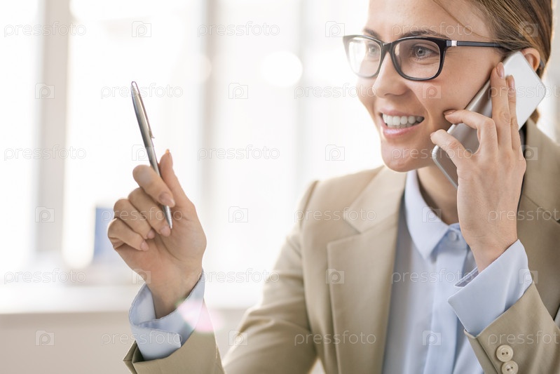 Предприимчивая женщина обсуждает проект по телефону