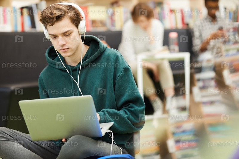 Студент-хипстер, использующий ноутбук в библиотеке