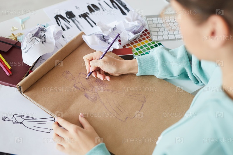 Вид на плечо модного дизайнера, сидящего за столом и мозговой штурм по поводу дизайна платья во время рисования эскиза