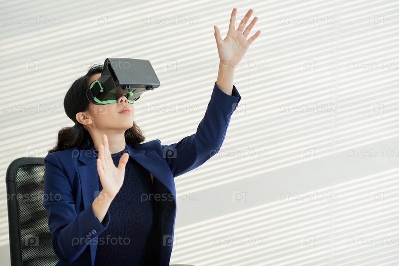 Деловая женщина, использующая очки виртуальной реальности в офисе