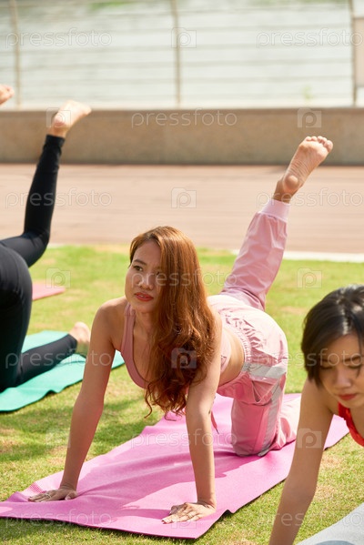 Женщины, работающие на ковриках на открытом воздухе