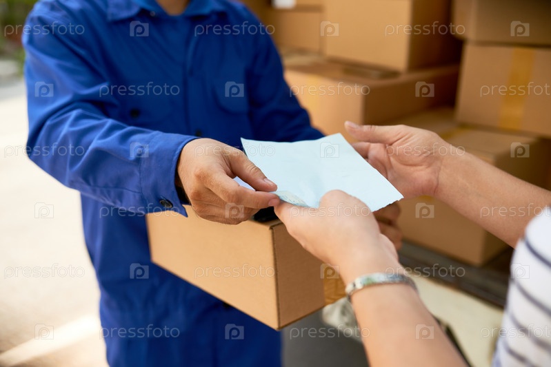 Доставщик передает бумагу женщине