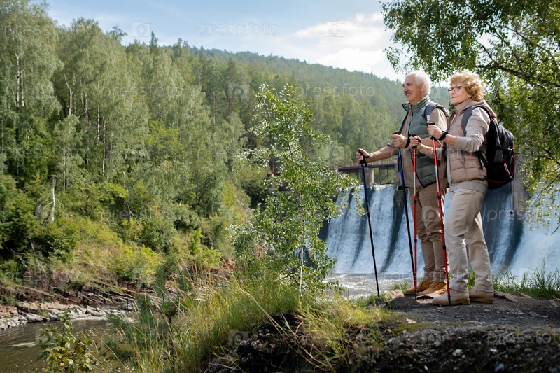 Два счастливых зрелых рюкзальщика в спортивной одежде, стоящих у лесной реки