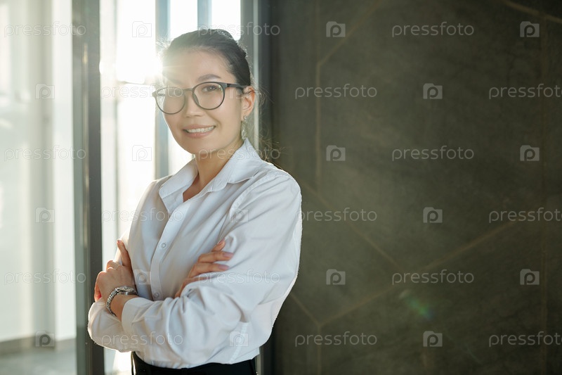 Красивая юная улыбающаяся бизнесвуменка азиатской этнической принадлежности, держащая руки за грудь