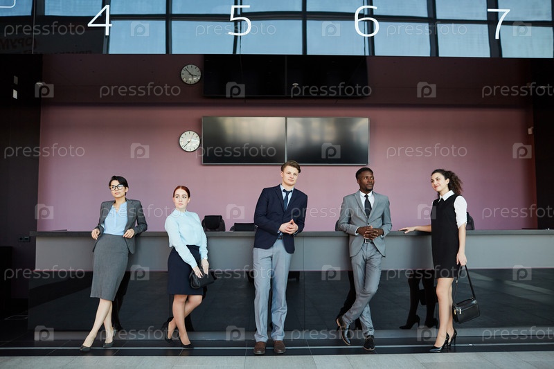 Современные бизнесмены, стоящие за стойкой в аэропорту