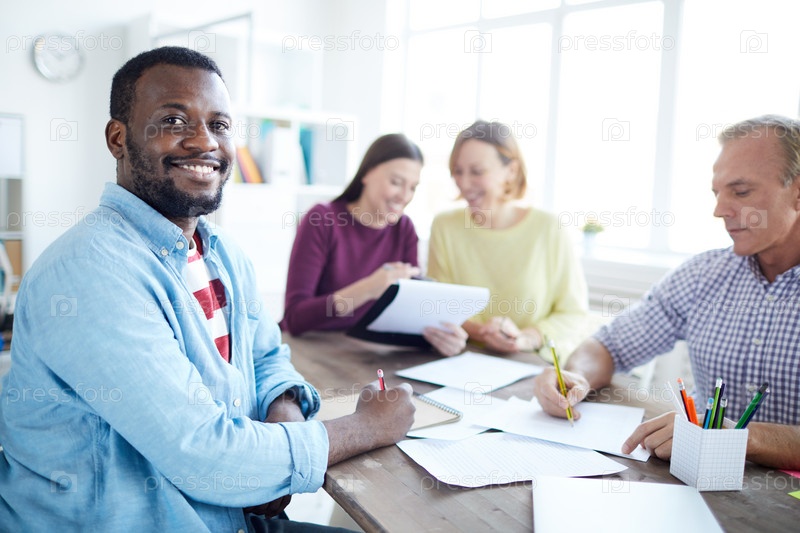 Счастливый красивый молодой афроамериканский дизайнер в синей рубашке, сидящий за столом и смотрящий на камеру, предлагая свои идеи на встрече