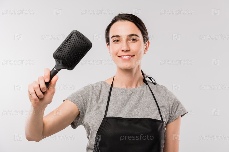 Молодая веселая парикмахерша держит щетку перед камерой