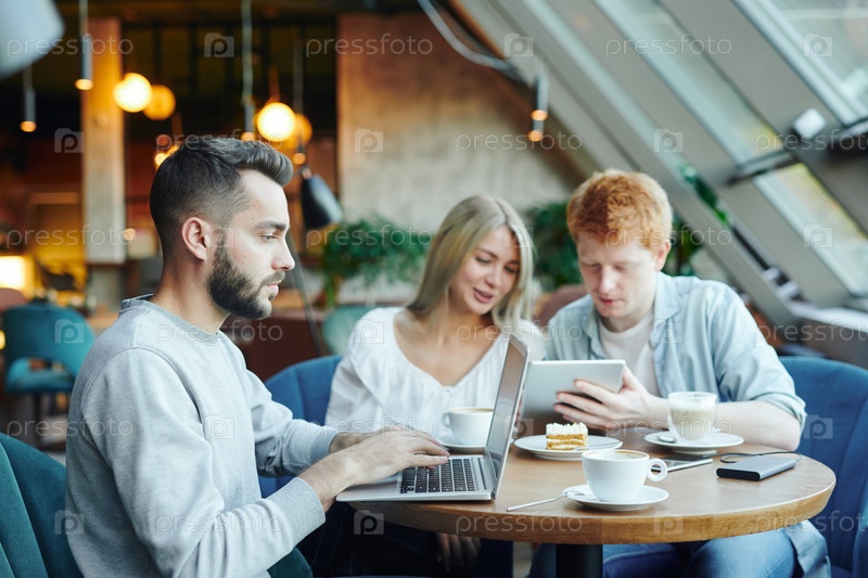 Молодой студент с сетью ноутбука на фоне своих друзей, использующих сенсорный планшет
