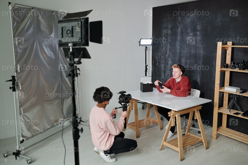 Молодой влоггер рассказывает о новом фотооборудовании перед оператором