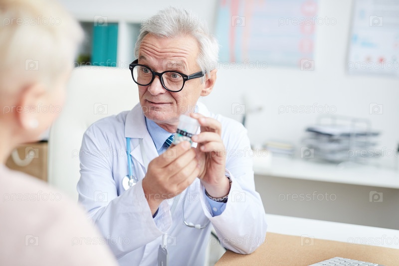 Контент старший врач в очках, хмурящийся на лбу во время назначения таблеток пациенту на консультации