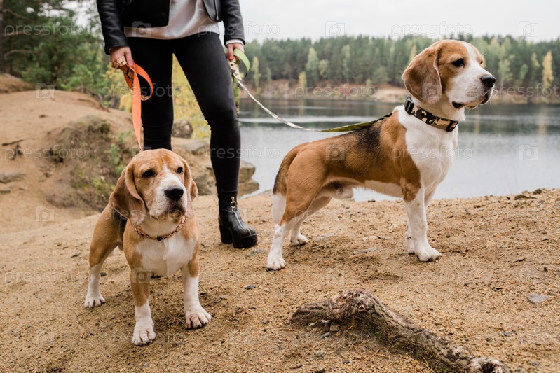 Молодая женщина в тонких джинсах и кожаном куртке отдыхает с милыми щенками-биггелями