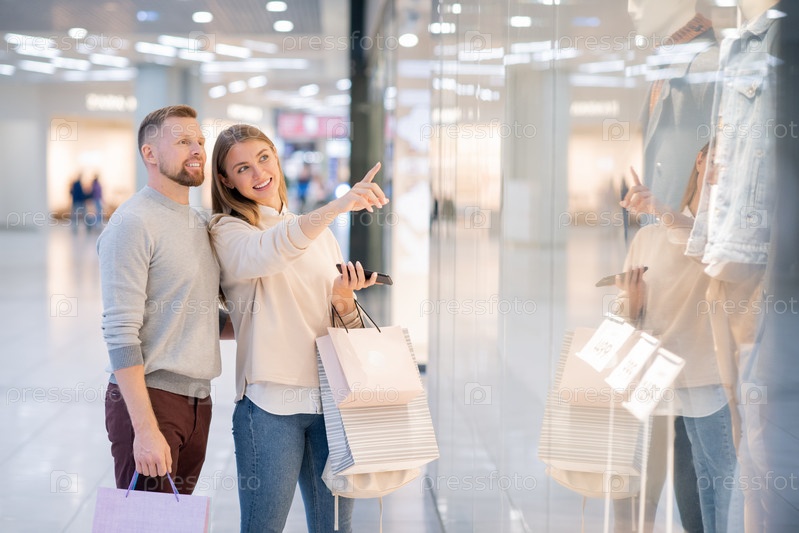 Улыбающаяся девушка указывает на одну из курт в витрине магазина, разговаривая с мужчиной