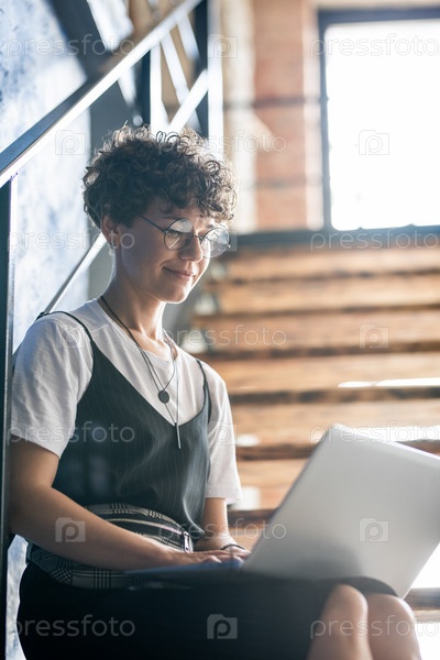 Молодой дизайнер или деловая женщина в повседневной одежде смотрит на дисплей ноутбука