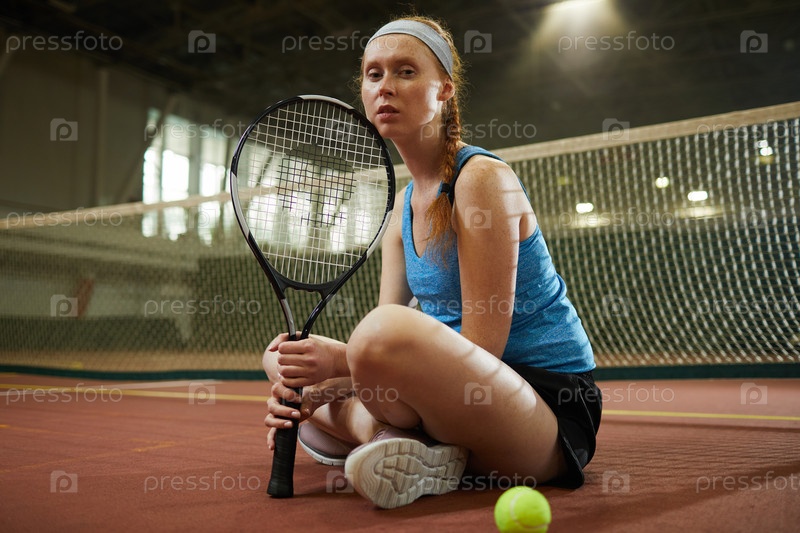 Портрет усталой привлекательной молодой теннисистки с красной косы, сидящей со скрещенными ногами на корте и ожидающей тренировки
