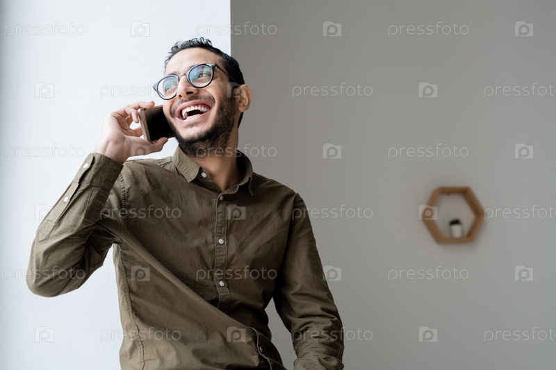 Счастливый молодой бизнесмен, разговаривающий по мобильному телефону у окна офиса