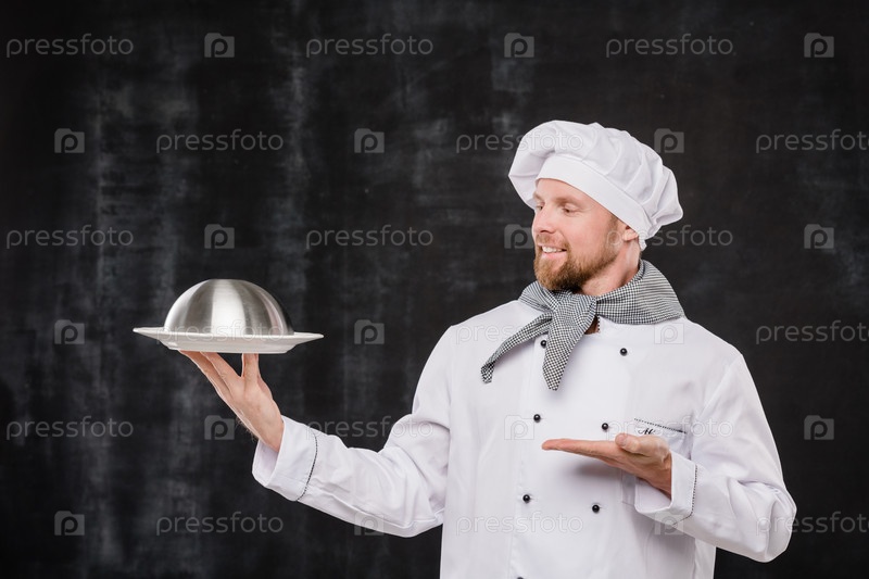 Молодой улыбающийся шеф-повар в униформе смотрит и указывает на cloche с приготовленной едой