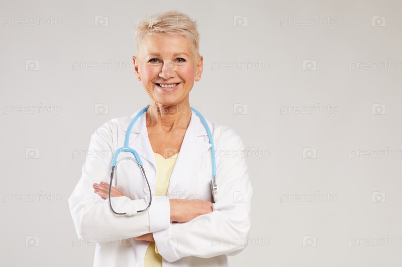 Портрет позитивного зрелого женского врача общей практики со стетоскопом, стоящего на белом фоне и скрестивших руки на груди