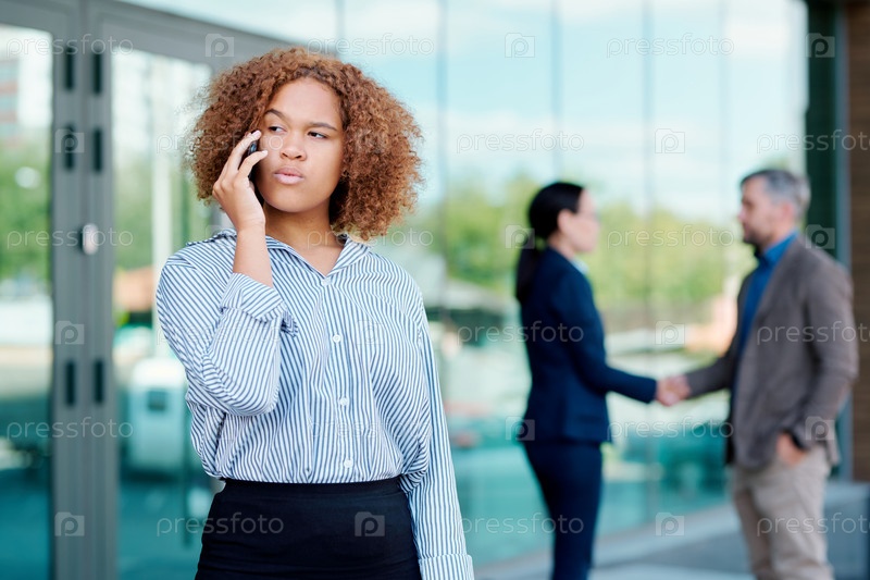 Молодая серьезная бизнес-леди разговаривает с одним из партнеров по телефону на улице