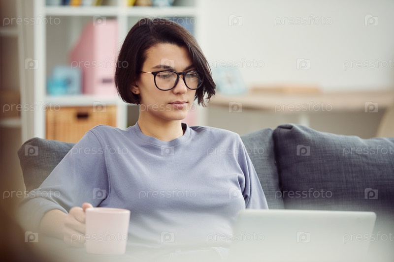 Серьезная молодая женщина в очках, сидящая на удобном диване и использующая ноутбук во время работы дома