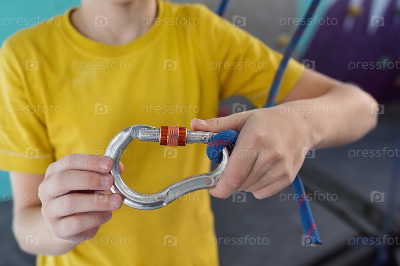 Руки школьника в желтой футболке, держащего карабинер на веревке