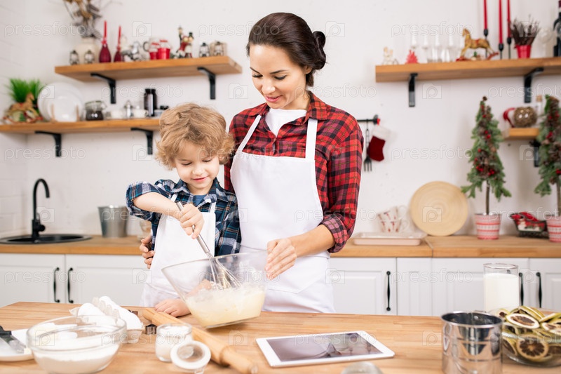 Маленький мальчик учится чистить яйца для теста, стоя рядом со своей матерью