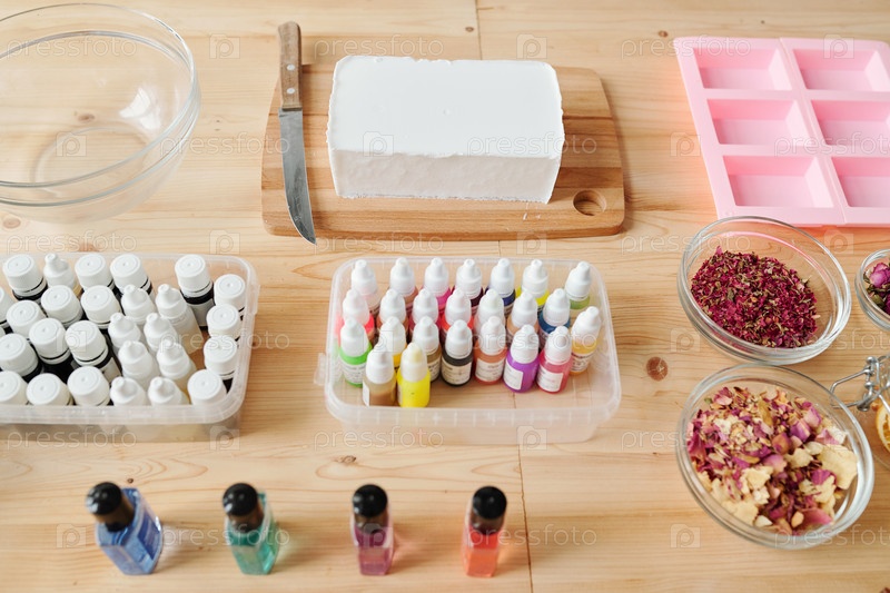 Бар белой твердой мыльной массы, эфирных масел и сухих цветочных лепестков в мисках