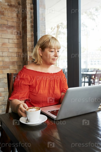 Женщина работает на ноутбуке в кафе