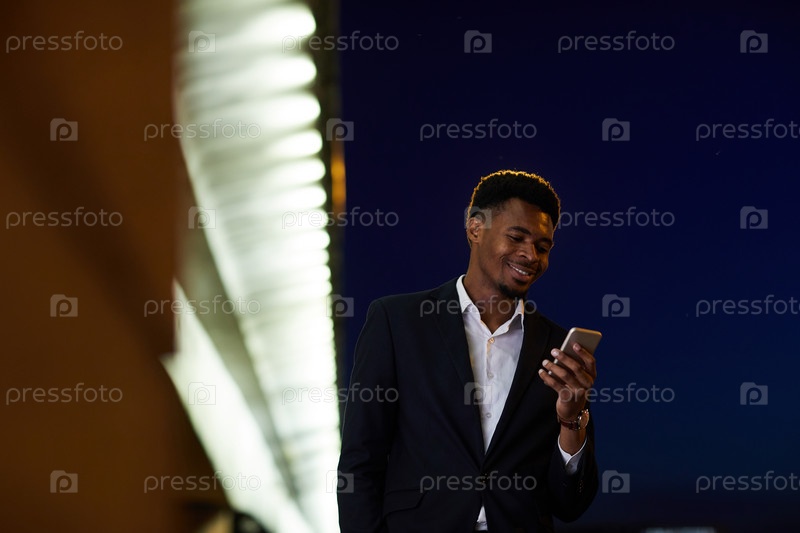 Позитивный красивый молодой чернокожий бизнесмен в костюме, движущийся по темной городской улице и проверяющий сообщение на телефоне