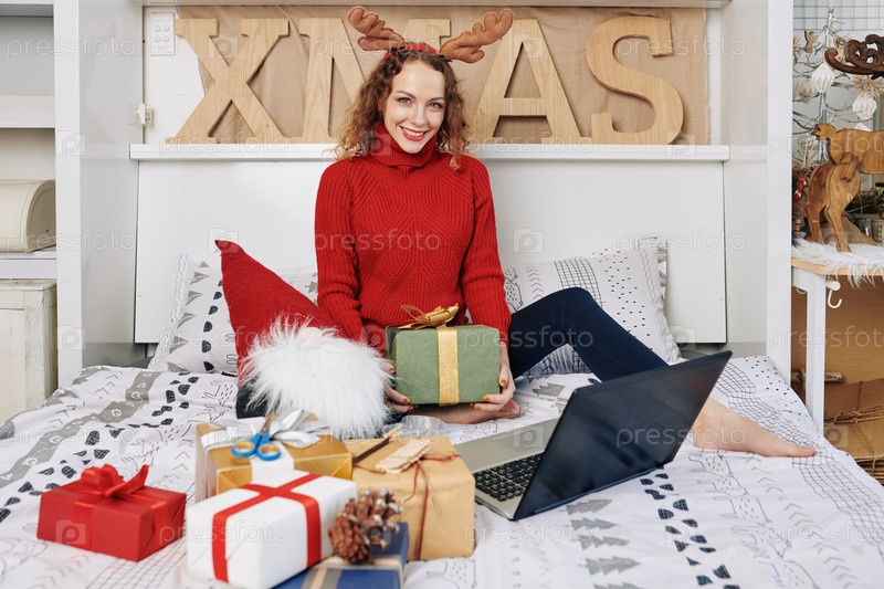 Женщина позирует с рождественскими подарками