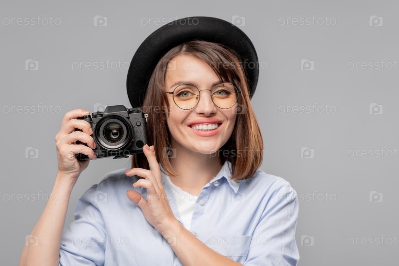 Счастливая молодая женщина-фотограф заставляет вас обращать внимание на камеру