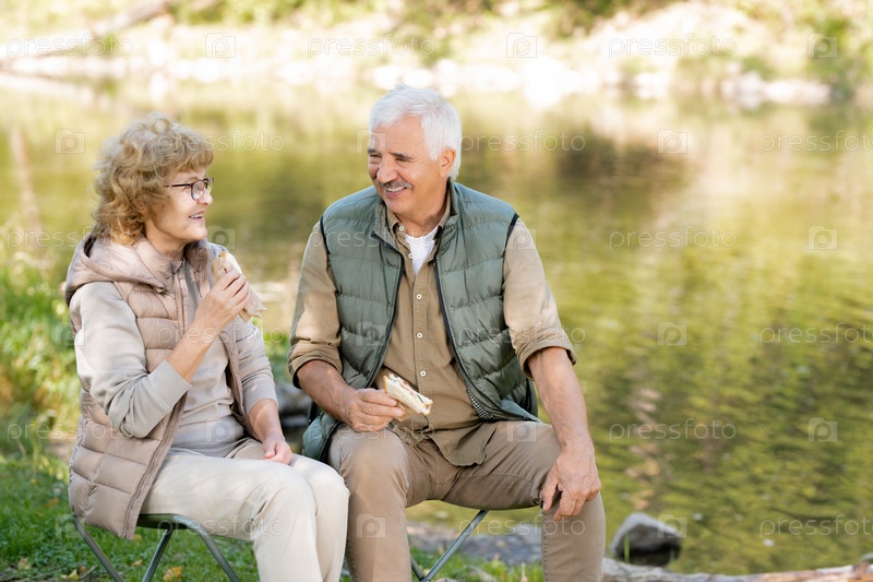 Два счастливых зрелых туриста с бутербродами обсуждают забавные моменты своей поездки