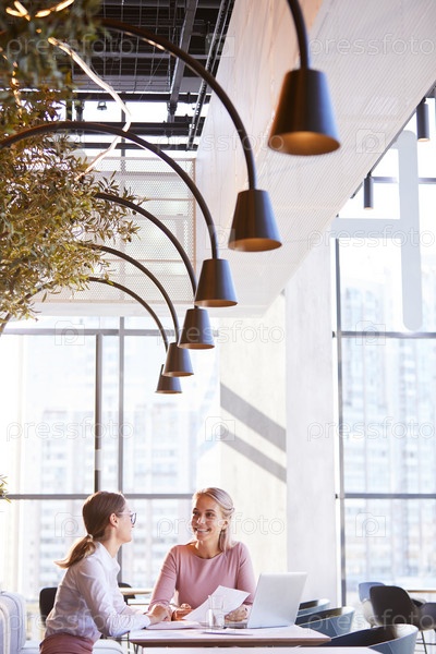 Улыбающиеся уверенные молодые женщины, сидящие за столом в деловом кафе с висящими лампами и просматривающими бумаги во время совместной работы над отчетом