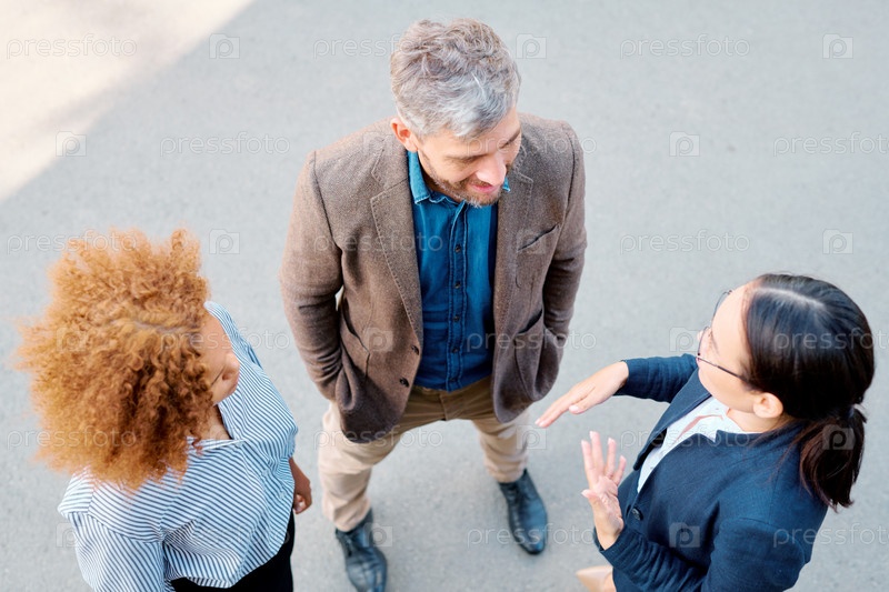 Трое молодых сотрудников в формальной одежде обсуждают рабочие моменты
