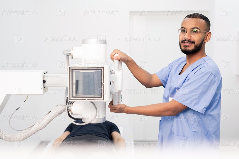 Успешный молодой врач в синей форме и очках, используя новое оборудование