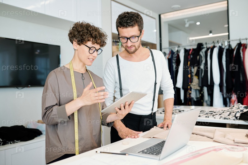 Один из молодых портных с планшетом делает презентацию творческих идей