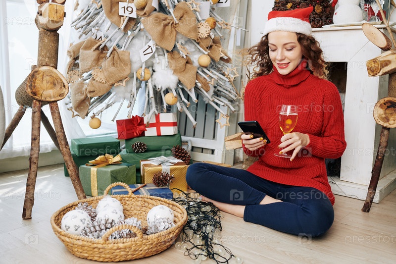 Красивая женщина, отправляющая сообщения в Санта-Хэт