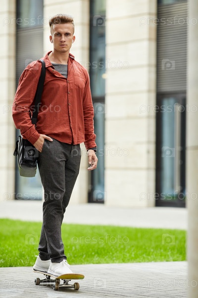Красивый молодой студент, катающийся на скейтборде