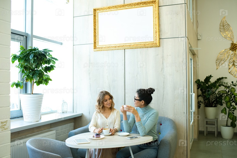 Две дружелюбные молодые женщины в повседневной одежде пьют кофе на мягком удобном диване