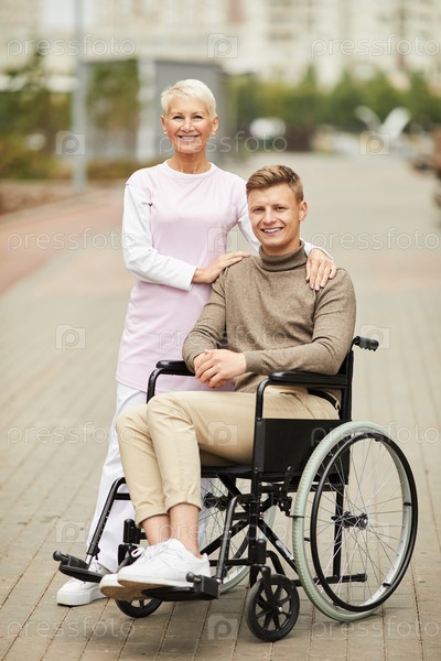 Портрет содержимого привлекательная зрелая леди с значком, висящим на шее, помогает парню в инвалидной коляске во время прогулки