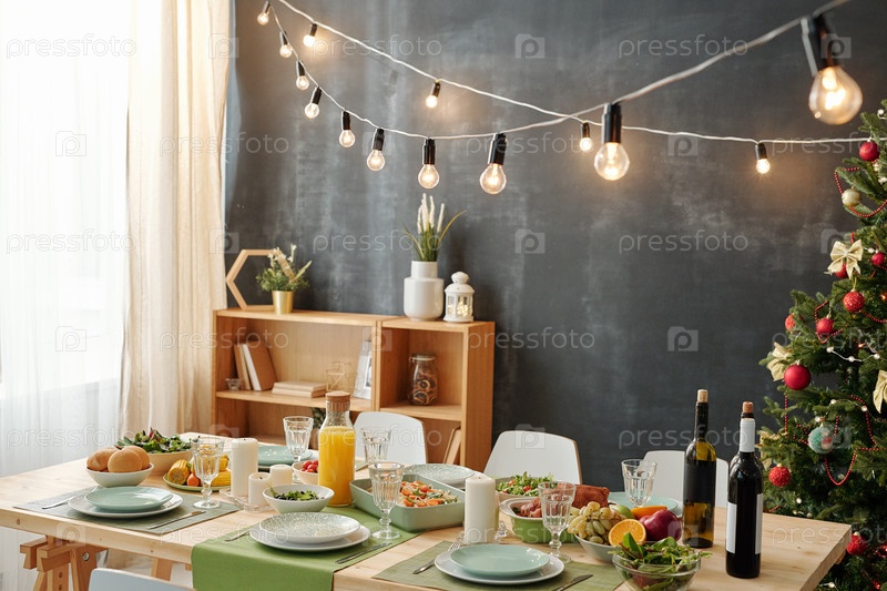 Праздничный стол подают на рождественскую вечеринку с лампами, висящими над едой